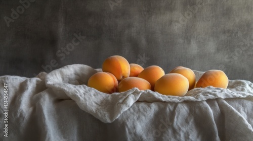 Apricots resting on a soft linen cloth, minimalistic and elegant presentation