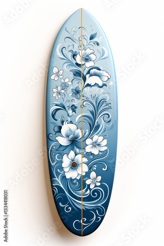 Aquatic Elegance: A Blue Surfboard Adorned with Ornate White Floral Designs and a Striped Core, evoking a sense of summer and tranquility.