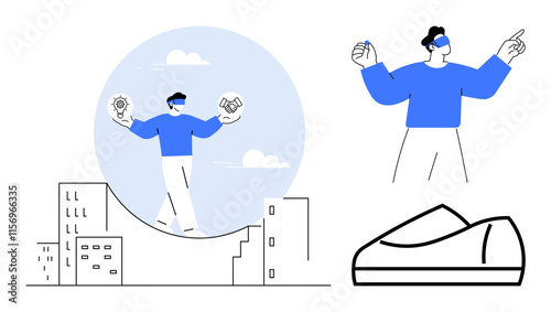 AR glasses-wearing individual standing on cityscape with light bulb and handshake icons. Additional view shows close-up interactions and smart shoe concept. Ideal for technology, innovation, AR