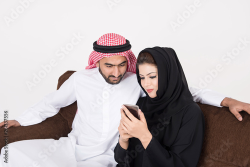 arabia, enjoyment, flirting, laughing, male, mobile phone, saudi, sharing, sofa, phone, emirate, video, white background, young adult, adult, arab, arabic, beauty, boyfriend, chair, cheerful, dating, family, female, fun, girlfriend, happiness, holding, husband, islam, looking, married, man, muslim, people, sitting, smiling