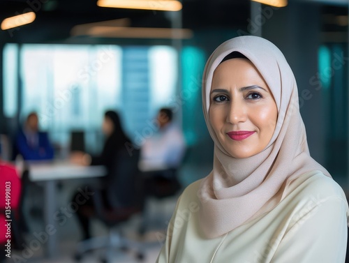 Arabian Businesswoman in office with Businesspeople meeting in the background, Arabian woman wearing Hijab in office with her colleagues in background