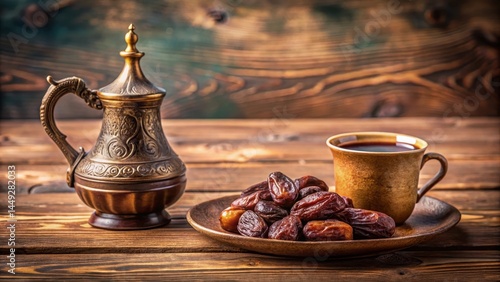 Arabic coffee dallah in a traditional cup alongside dates on a wooden table, dates