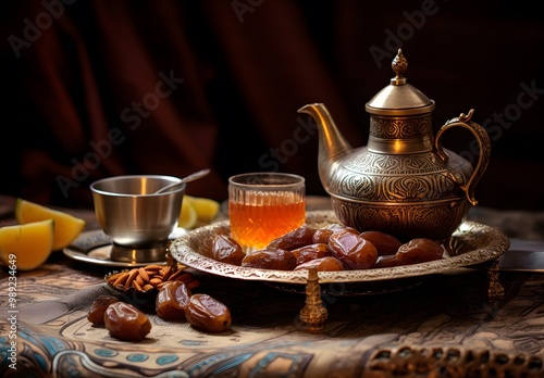 arabic, hot drink, service, date, baklava, silver, teapot, table, decorative, patterned, plate, saffron, background, warm, earthy, tone, traditional, middle eastern, culture, food, drink, sweet, dessert, tea, glasses, metal, gold, brown, orange, pattern, design, texture, still life, photo, food photography, gastronomy, culinary, ramadan, eid, festive