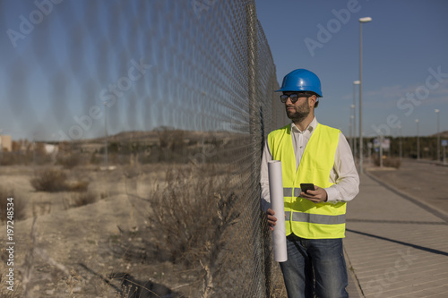 Architect or Engineer using mobile Phone on the Construction Site. holding blueprints Daytime. Wearing protection equipment