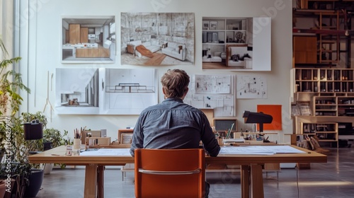 architect, workspace, design, office, architecture, blueprint, plan, interior, furniture, table, chair, bookshelf, plant, creative, concept, engineering, drawing, sketch, model, project, planning, drafting, construction, development, studio, professional, career, inspiration, idea, work, focused, productivity, brainstorming, research, analysis, process, creativity