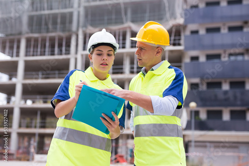 Architects man and woman in reflective waistcoats discussing construction plan at building site
