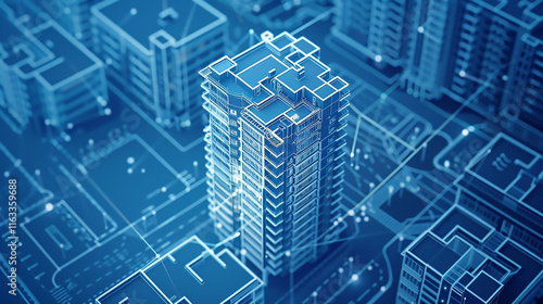 Architectural blueprint of a modern house layout, featuring detailed floor plan design. Detailed architectural blueprint showcasing floor plans with a digital, futuristic design in cool blue tones.