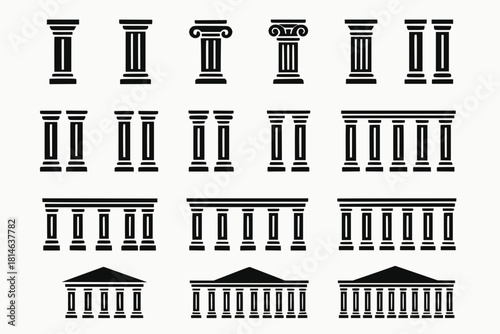 Architectural Column Icons in Structural Rhythm with Single Paired Colonnade and Peristyle Arrangements in Black Vector Style on White Background