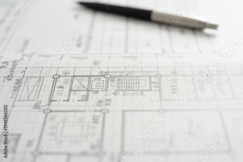 一級建築士試験の建築図面とペンのクローズアップArchitectural Drawing and Pen Close-up