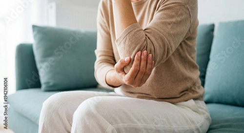 Arm and Elbow Pain Concept, Woman Supporting Painful Joint in Minimal Home Interior
