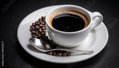Aromatic black coffee in a white cup sits on a saucer with roasted coffee beans and a spoon, a perfect morning brew