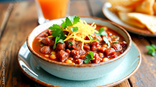 aromatic chili with beans and corn in a rustic bowl