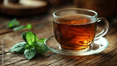 Aromatic Cup of Mint Tea on Rustic Wooden Table