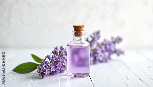lilac, essential oil, bottle, flower, purple, fragrance, aroma, spa, relaxing, natural, beauty, wellness, floral, plant, cosmetic, treatment, perfume, spring, blooming, botanical, white, wood, wooden, background, texture, still life, healthy, lavandula, herbal