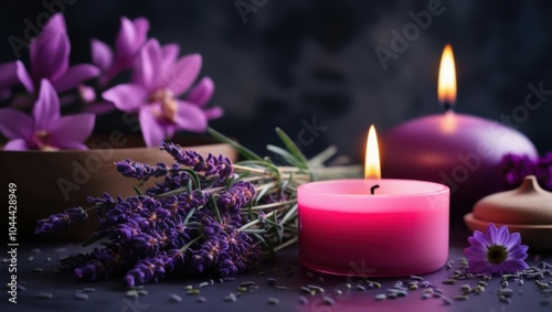 aromatic spa scene, pink lit candle, lavender flowers, wooden bowl, white towel, dark background, soft focus, relaxation, wellness, aromatherapy, tranquil atmosphere, purple hues, candlelight glow, ze