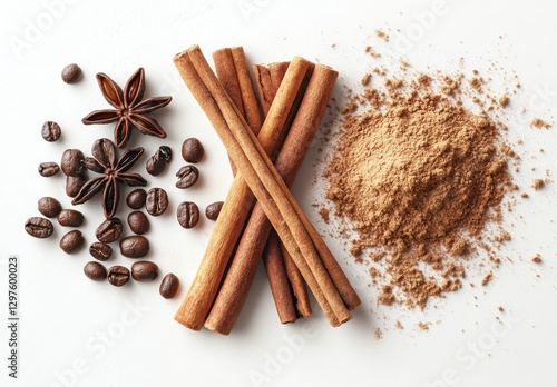 Aromatic Spices and Coffee Details with Cinnamon Sticks, Whole Coffee Beans, Ground Cinnamon, and Star Anise on Rustic Background