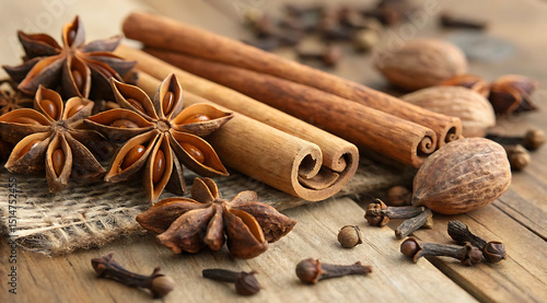 Aromatic star anise, cinnamon sticks, cloves, and nutmeg on a rustic wooden table, creating a warm and inviting culinary still life with natural ingredients