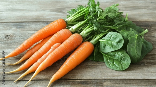 Arranging organic carrots onions and spinach on a board a culinary delight in a rustic kitchen