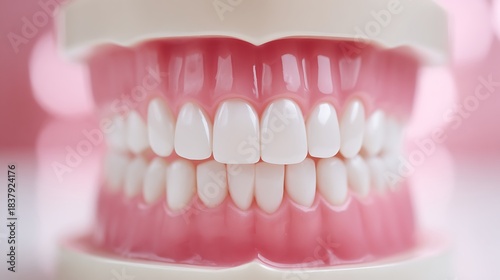 Artificial dental model showing clean white teeth and pink gums with dental theme in close up view.