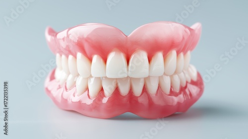 Artificial dentures with white teeth and pink gums isolated on clean background symbolizing dentistry oral care prosthetics hygiene and dental health, Generative AI