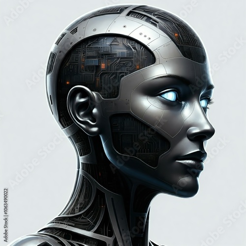 Artificial Intelligence. A close-up profile of a female cyborg with metallic skin and visible internal mechanisms. Her expression is neutral, her blue eyes glowing softly.