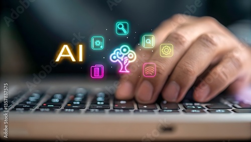 Artificial Intelligence and mobile technology concept. Man using AI. generative AI. innovation. smartphone. Holding ai text