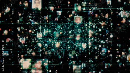 artificial intelligence concept of a social network with a stream of unrecognizable people connecting each other in the internet with blue lines on black background, 3d rendering 4K footage