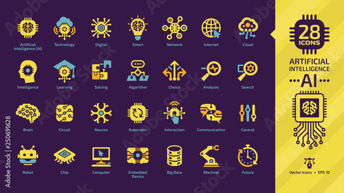 Artificial intelligence yellow icon set on a dark violet background with Ai machine learning, digital technology, smart network, cloud computing, solving, algorithm, analysis, search and choice sign.
