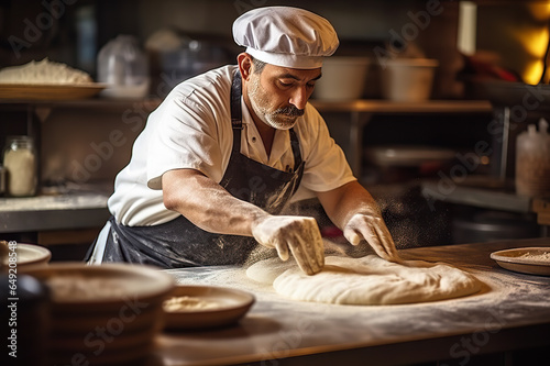 Artisan Baker Crafting Fresh Bread Kneading Dough and Baking in a Flour-Dusted Bakery Kitchen Restaurant. created with Generative AI
