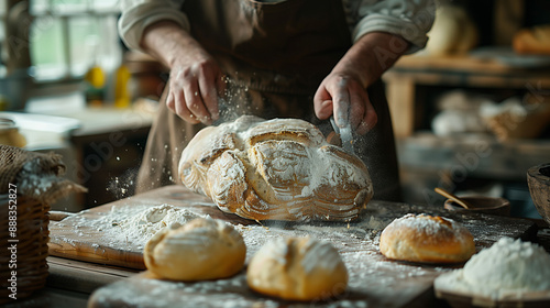 baker, artisan, bread, rustic, flour, table, wooden, warm, cosy, atmosphere, traditional, craftsmanship, hand, preparation, kitchen, baking, food, homemade, dough, natural, cooking, hand-made, culinary, wooden table, floury, bakery, culinary arts, comforting, warm tones, vintage, skilful, closeup, food preparation