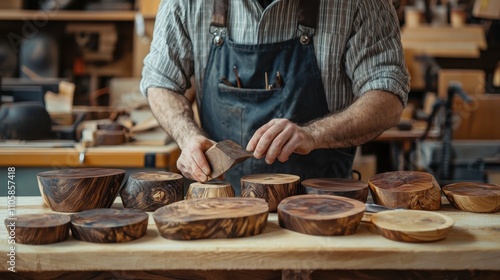 Artisan Craftsman Showcasing Wood Textures in a Workshop Setting with Handmade Wooden Bowls