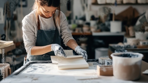 Artisan creating handmade paper, bright studio, clean background, minimal elements, copy space