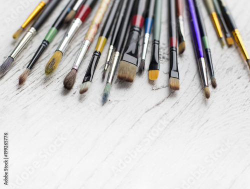 paint, brush, brush, paintbrush, art, artist, colours, acrylic, oil, painter, artistic, tool, colourful, closeup, object, bristle, equipment, work, creativity, dirty, set, used, nobody, education, white, background, wood, group, creative, concept, craft
