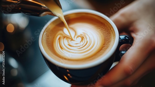 Artistic Barista Techniques Creating Beautiful Latte Art in a Warm Coffee Cup with Creamy Swirls and a Cozy Atmosphere