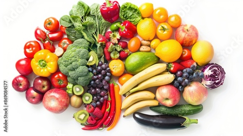 Artistic brain representation using assorted fruits and vegetables, isolated on white, emphasizing healthy choices.