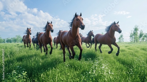 Artistic depiction of horses running in a lush green field, under a clear sky. Dynamic and beautiful scene ideal for wall decoration.