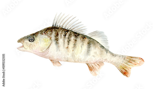 Artistic illustration of the river fish Perch. The illustration is hand drawn in watercolor. Suitable for design of educational aids, books and encyclopedias, interior design, postcards and packaging.
