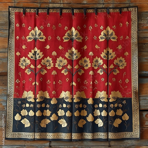 Artistic red and black fabric panel with gold floral pattern for home decor photo