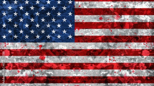 Artistic representation of an American flag featuring a grungy texture with splattered paint effects in blue, red, and white, symbolizing patriotism and freedom.