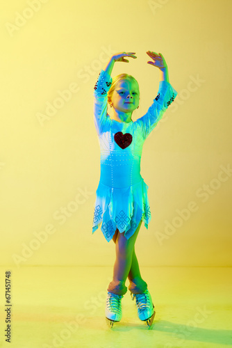 Artistic, talented little girl, child, performing figure skating in beautiful costume against yellow background in neon light. Concept of childhood, figure skating sport, hobby, school, education