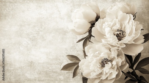 Artwork featuring sepia peony flowers on a textured concrete wall ideal for photo wallpaper murals and modern loft style decor