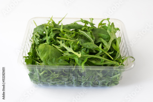 Arugula and spinach leaves in tray isolated on white. Fresh salad leaves in plastic container.