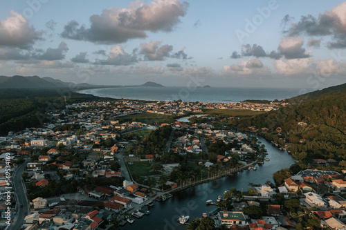 as Dorf - Stadt Barra da Lagoa. Ein Fluss mündet im Meer. Ein Dorf liegt direkt am Meer. Drohne Brasil 24