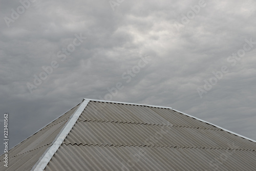 roof, housetop, sky, cloud, cloudy, infused, slope, wavy, metal, corrugated, undulating, day, grey, grey, closeup, closeup, closeup, gloomy, overcast, daylight, sparking, gloss, material, weather, architecture, construction