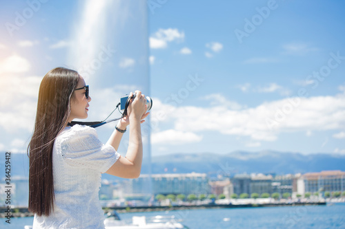 Asian beautiful woman is travel for holiday in the summer of Europe and taking a camera view landscape of lake and bright sky in Geneva Switzerland, copy space.