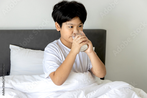 Asian boy holding glass of milk in bed at bedroom after waking up in morning. Sleepy chubby kid with milk glass in comfortable white bed. Portrait of Cute elementary school child drinking tasty milk.