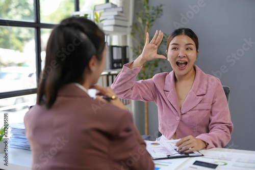 business, businesswoman, marketing, strategy, meeting, office, explaining, gesticulate, colleague, teamwork, collaboration, discussion, communication, work, professional, corporate, job, career, executive, management, finance, sale, analysis, project, plan, datum, chart, document, computer, desk, workplace, woman, female, adult, young, 2, people, indoor, day, window, natural, light, smiling, happy, excited, enthusiasm, asian