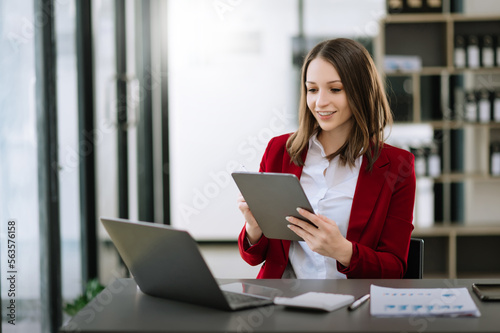 Asian businesswoman working in the office with working notepad, tablet and laptop documents .