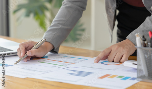 Asian businesswomen are analyzing graphs, Financial statistics and calculating corporate returns in private offices, Market research reports and income statistics, Financial and Accounting concept.