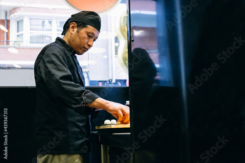 Asian chef preparing nigiris sushi